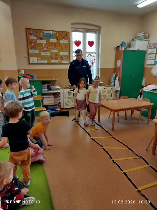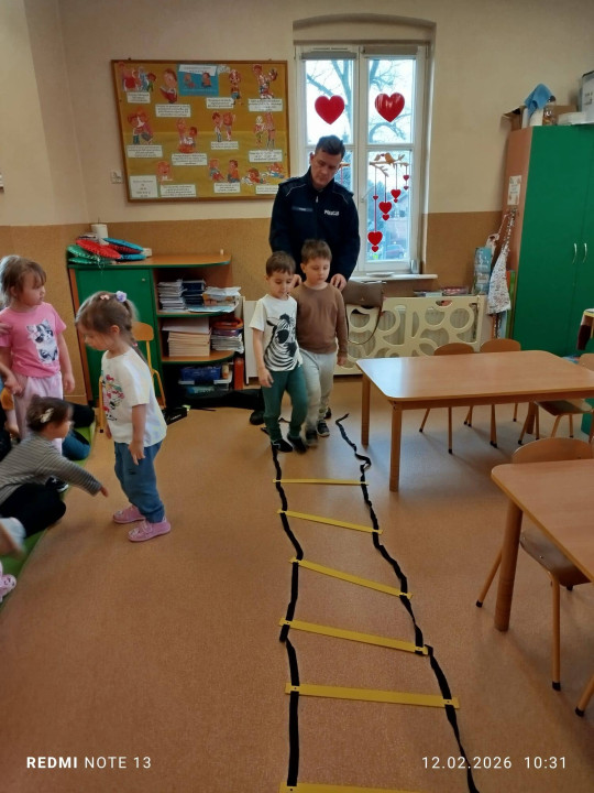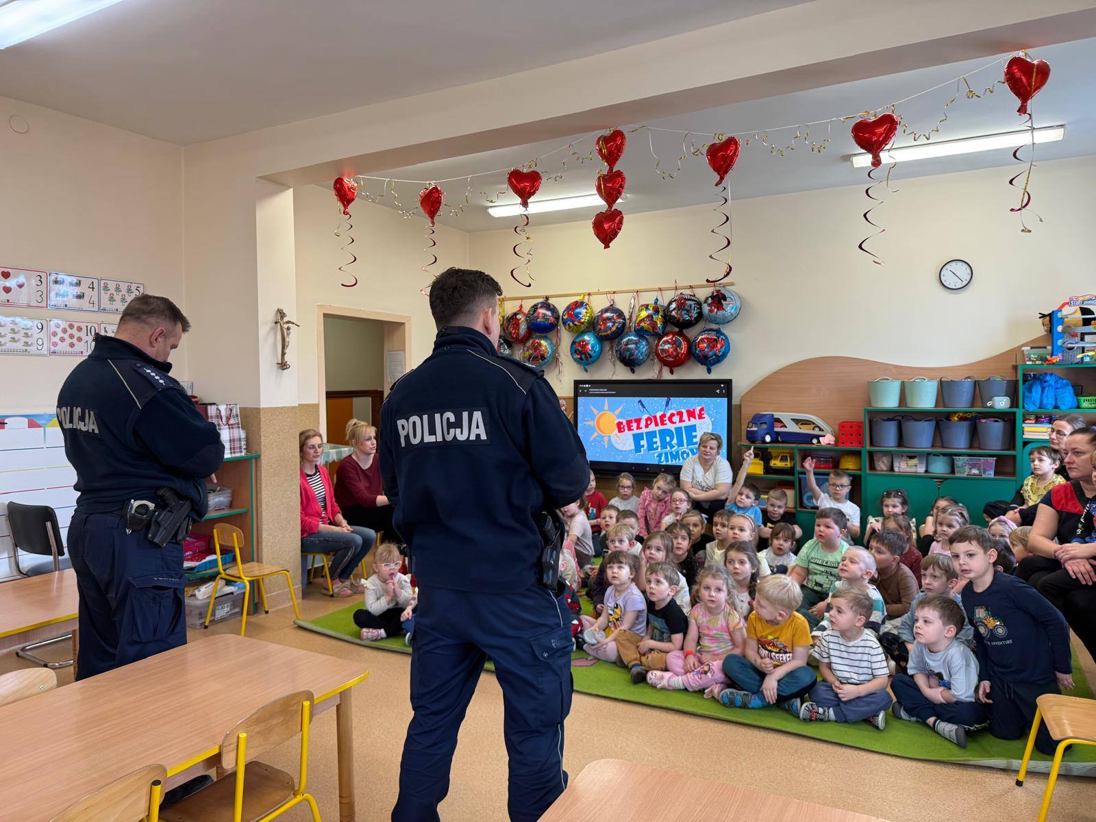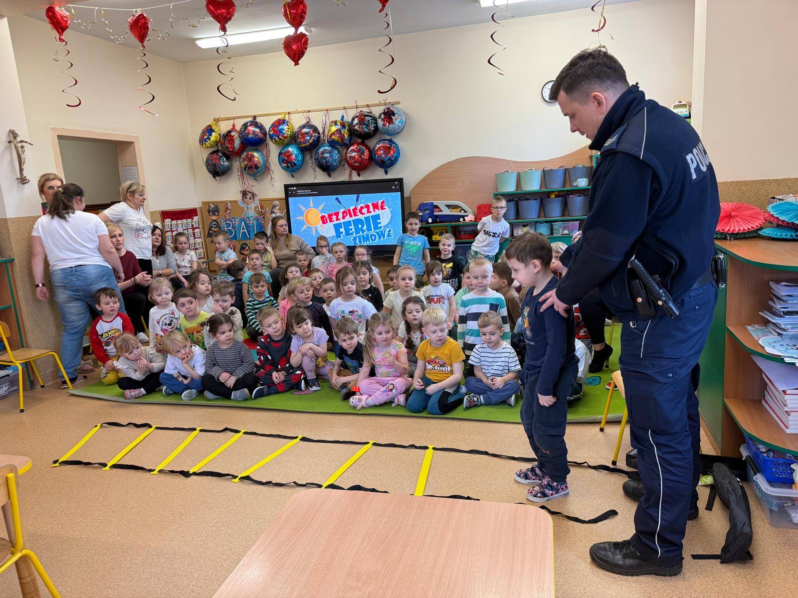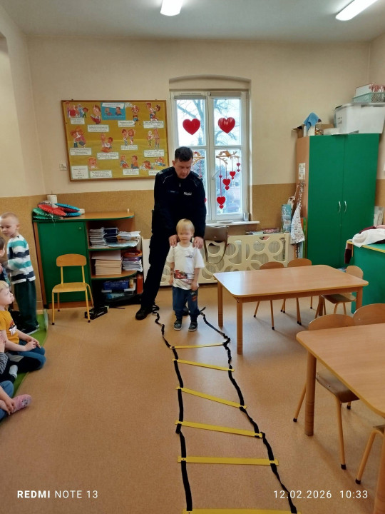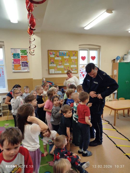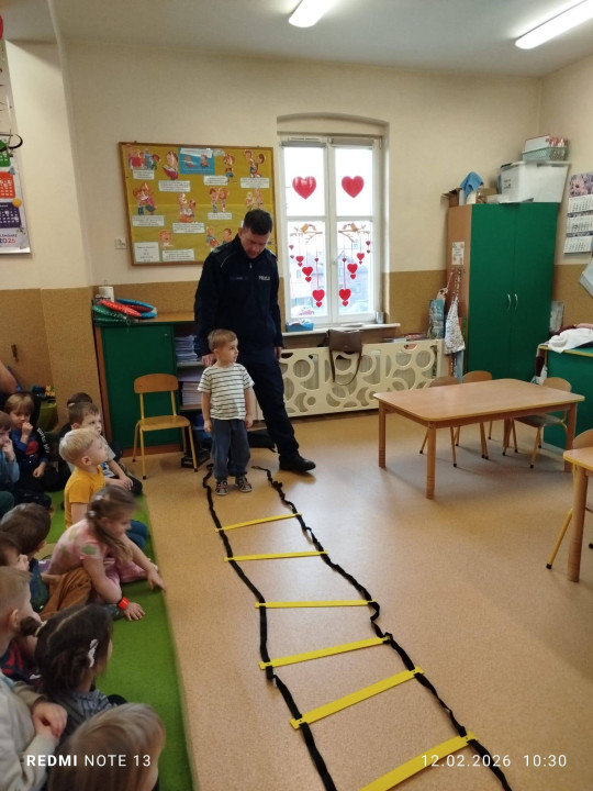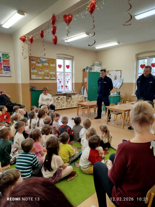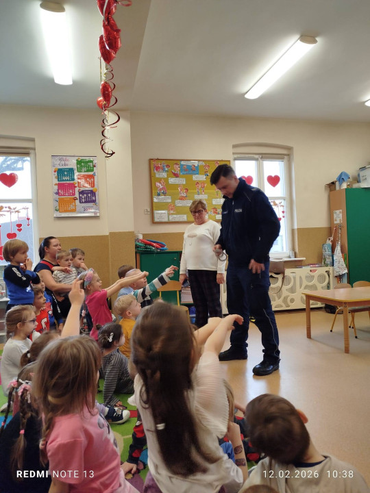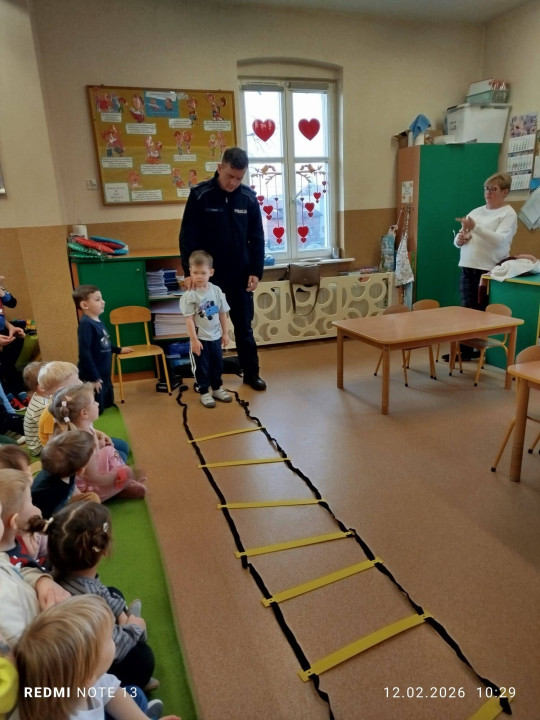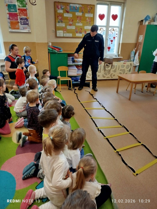 Celem wizyty było przypomnienie dzieciom najważniejszych zasad bezpieczeństwa podczas zbliżających się ferii zimowych. Przedszkolaki z dużym zainteresowaniem słuchały wskazówek dotyczących bezpiecznej zabawy na śniegu i lodzie, poruszania się po drodze, kontaktów z nieznajomymi oraz właściwego zachowania w sytuacjach zagrożenia.