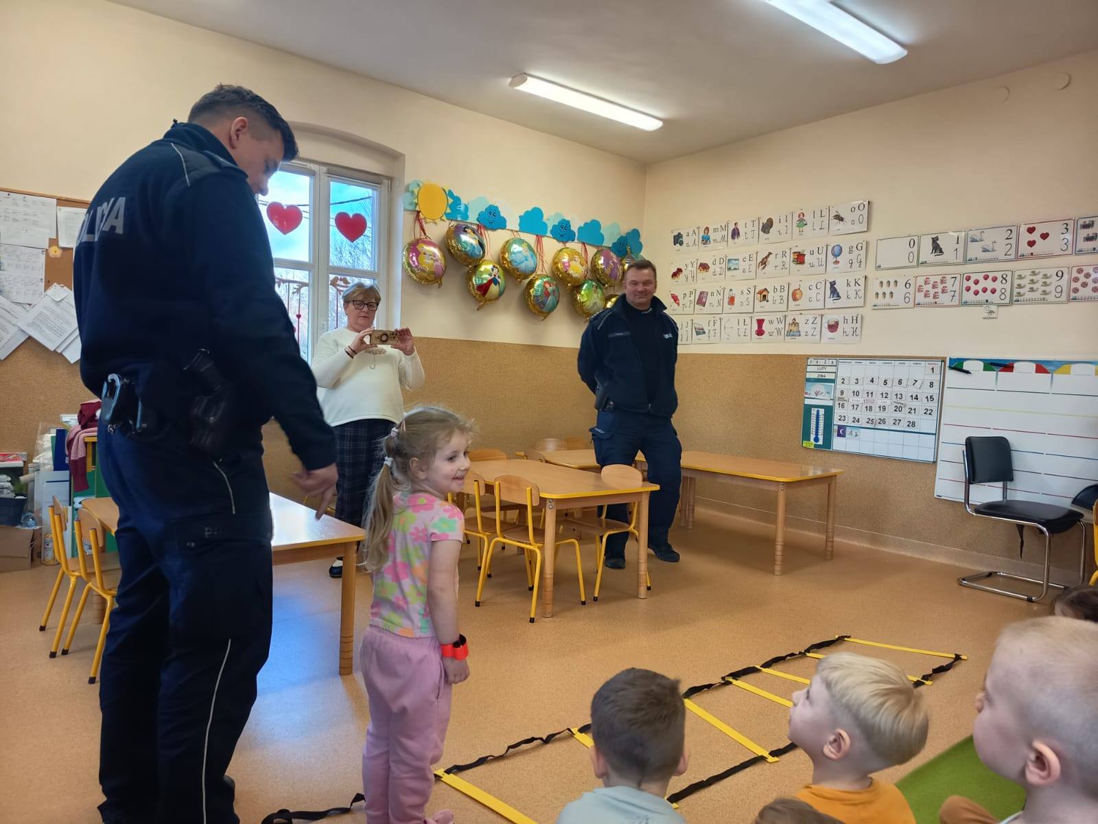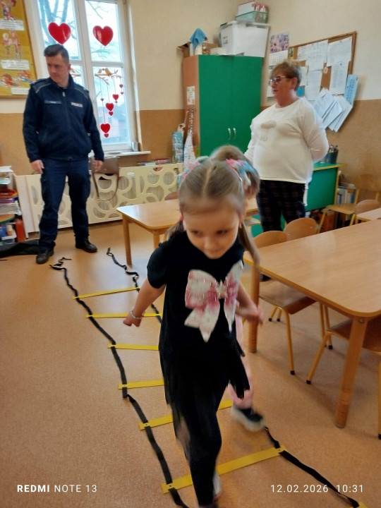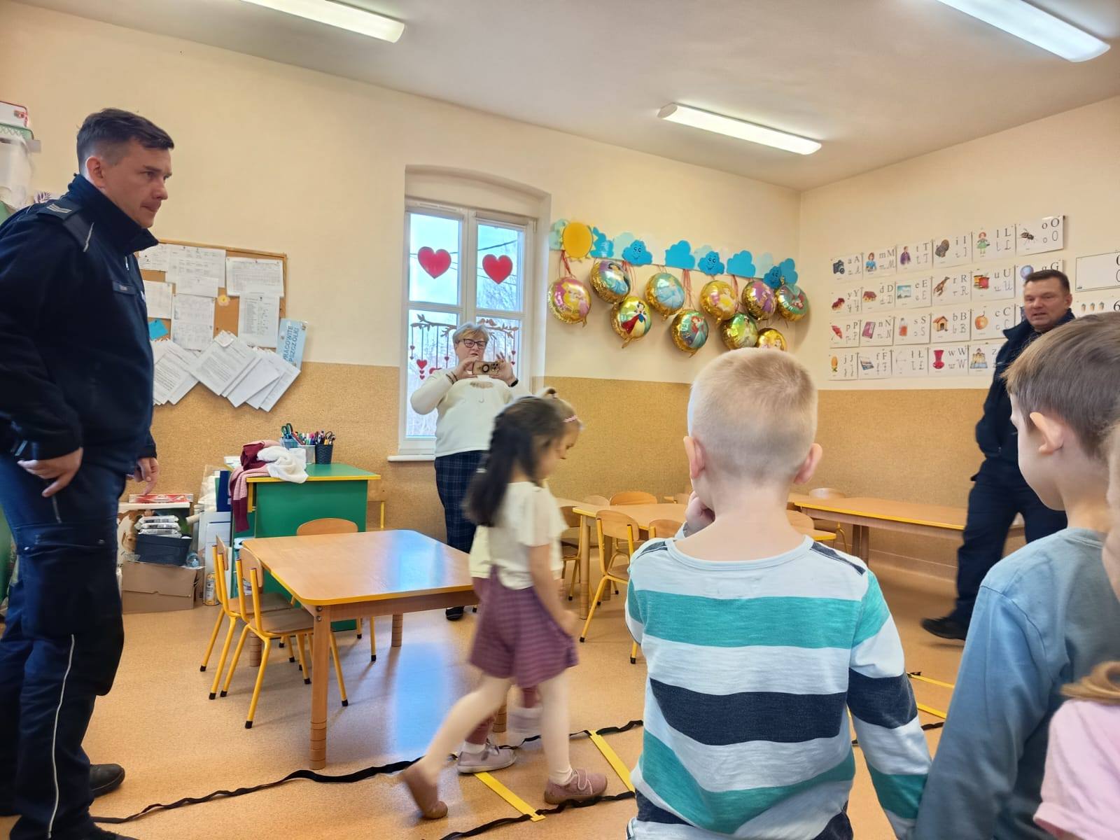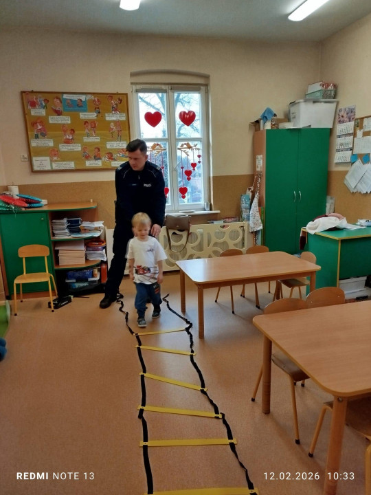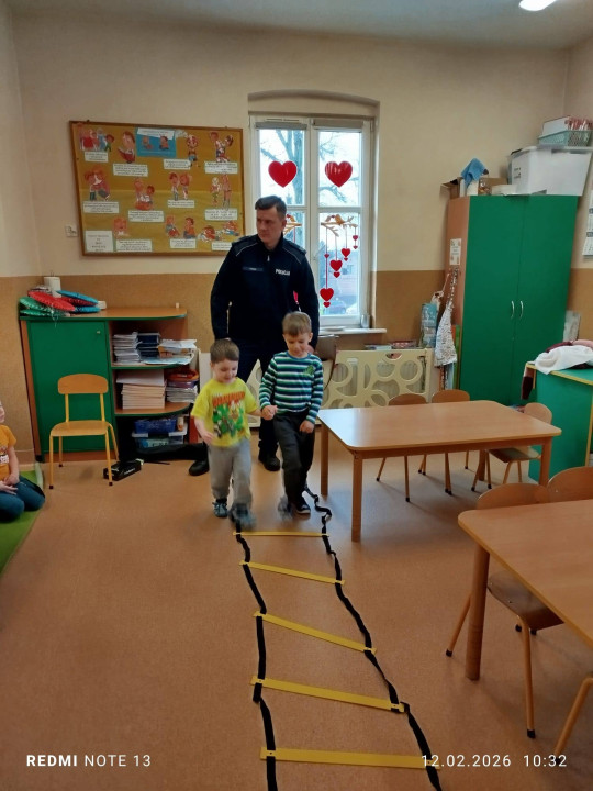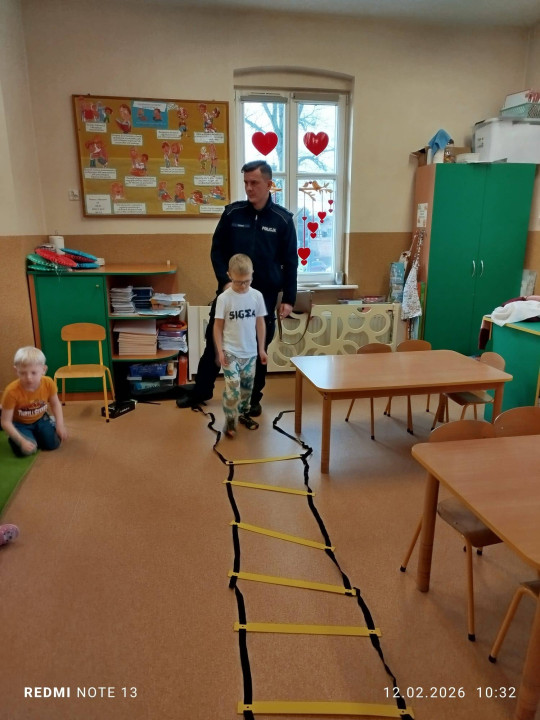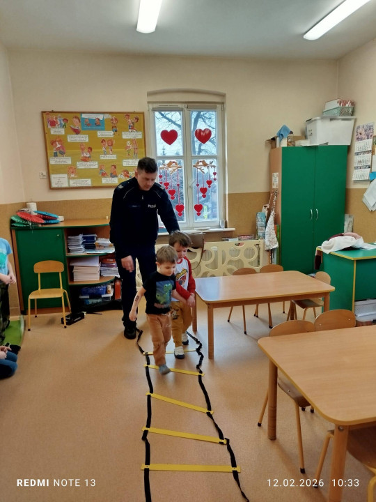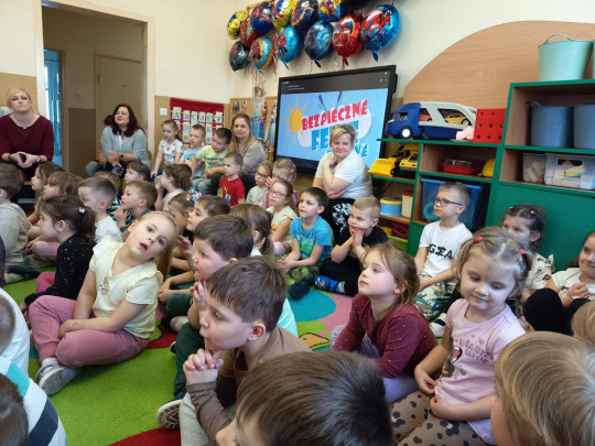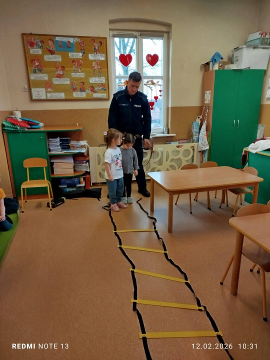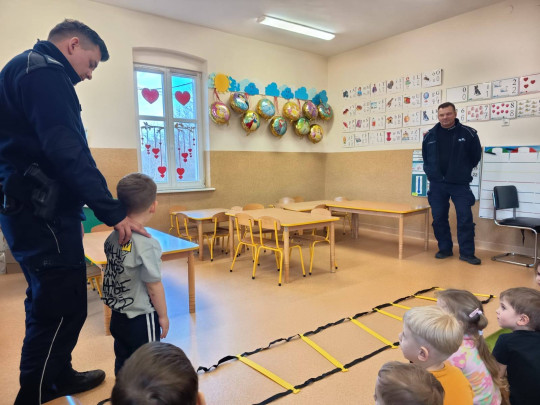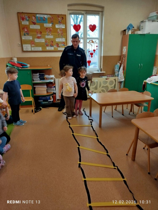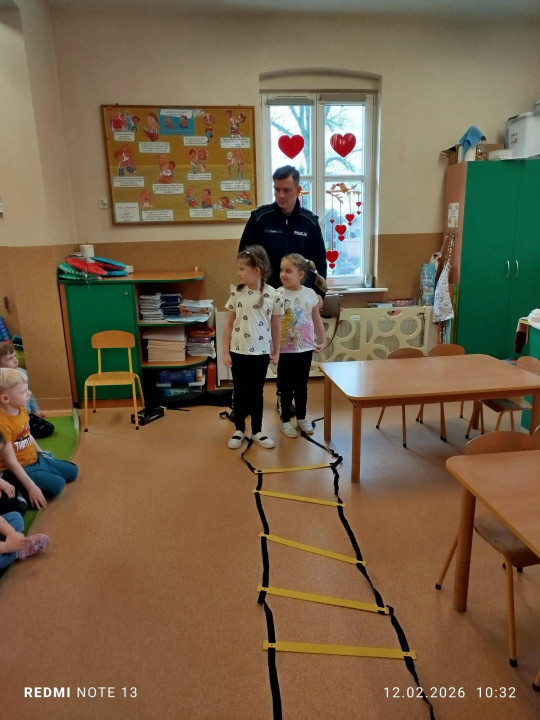 Celem wizyty było przypomnienie dzieciom najważniejszych zasad bezpieczeństwa podczas zbliżających się ferii zimowych. Przedszkolaki z dużym zainteresowaniem słuchały wskazówek dotyczących bezpiecznej zabawy na śniegu i lodzie, poruszania się po drodze, kontaktów z nieznajomymi oraz właściwego zachowania w sytuacjach zagrożenia.